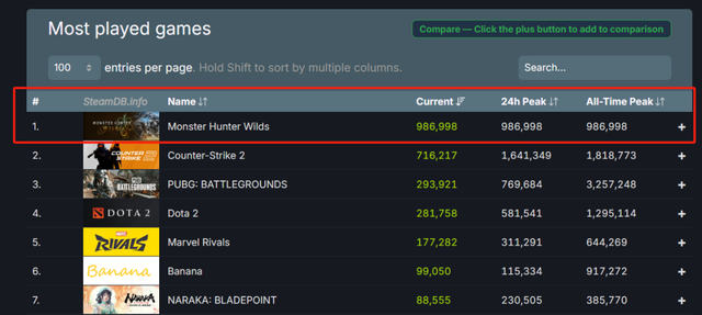 就在笔者撰写此文时,恰逢怪猎荒野解禁,根据SteamDB数据显示,此时全球同时在线游玩人数已经接近了100万这个量级,位于全球第一,其火爆程度可想而知。